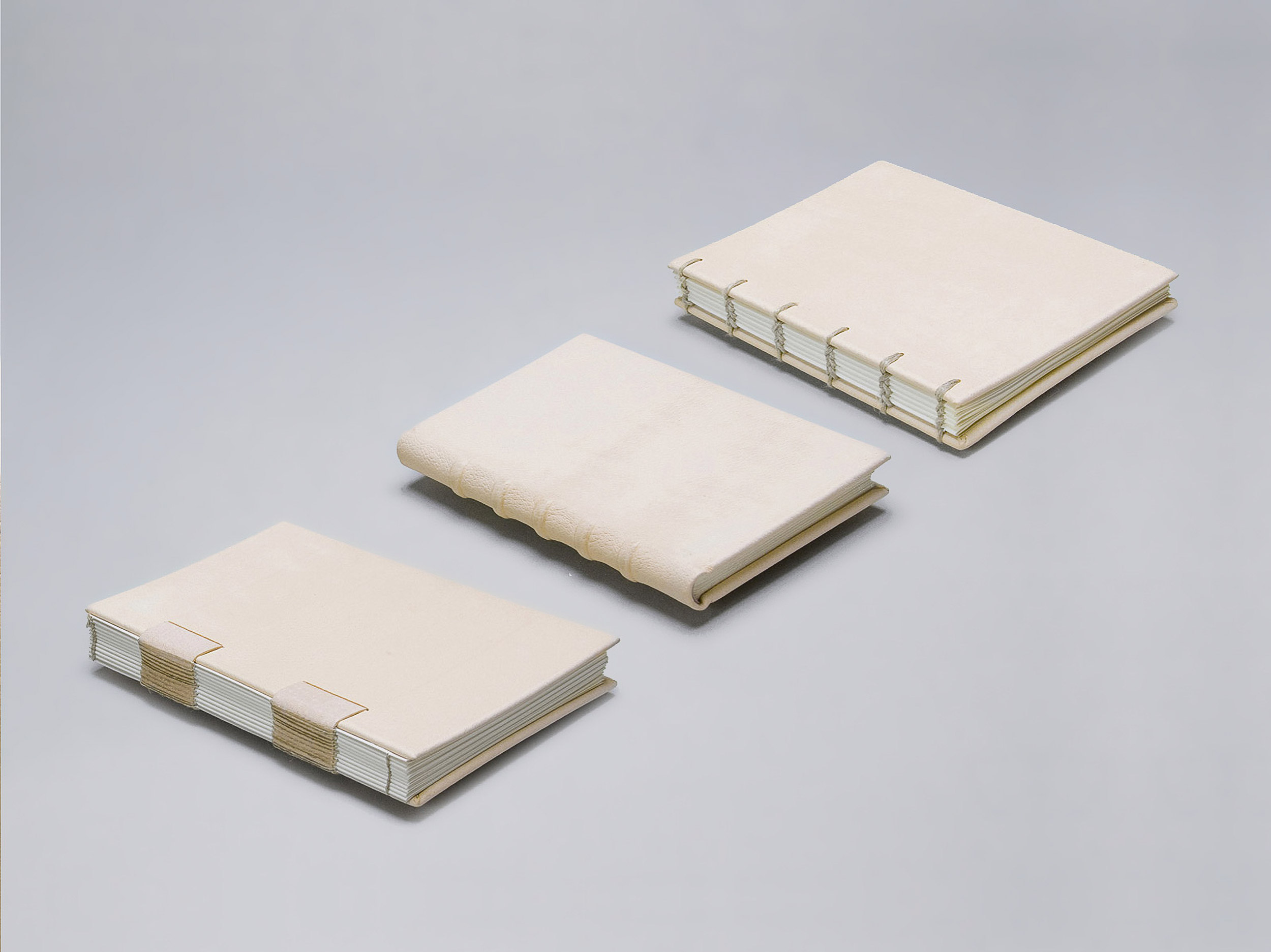 2023, sculpture, unique work, 15 ¼ x 12 ¾ cm / 6 x 5 inches, each. Hesitation Volumes Three volumes, artificial swine dermis, linen, board, mercerized cotton, thread, paste, vellum.