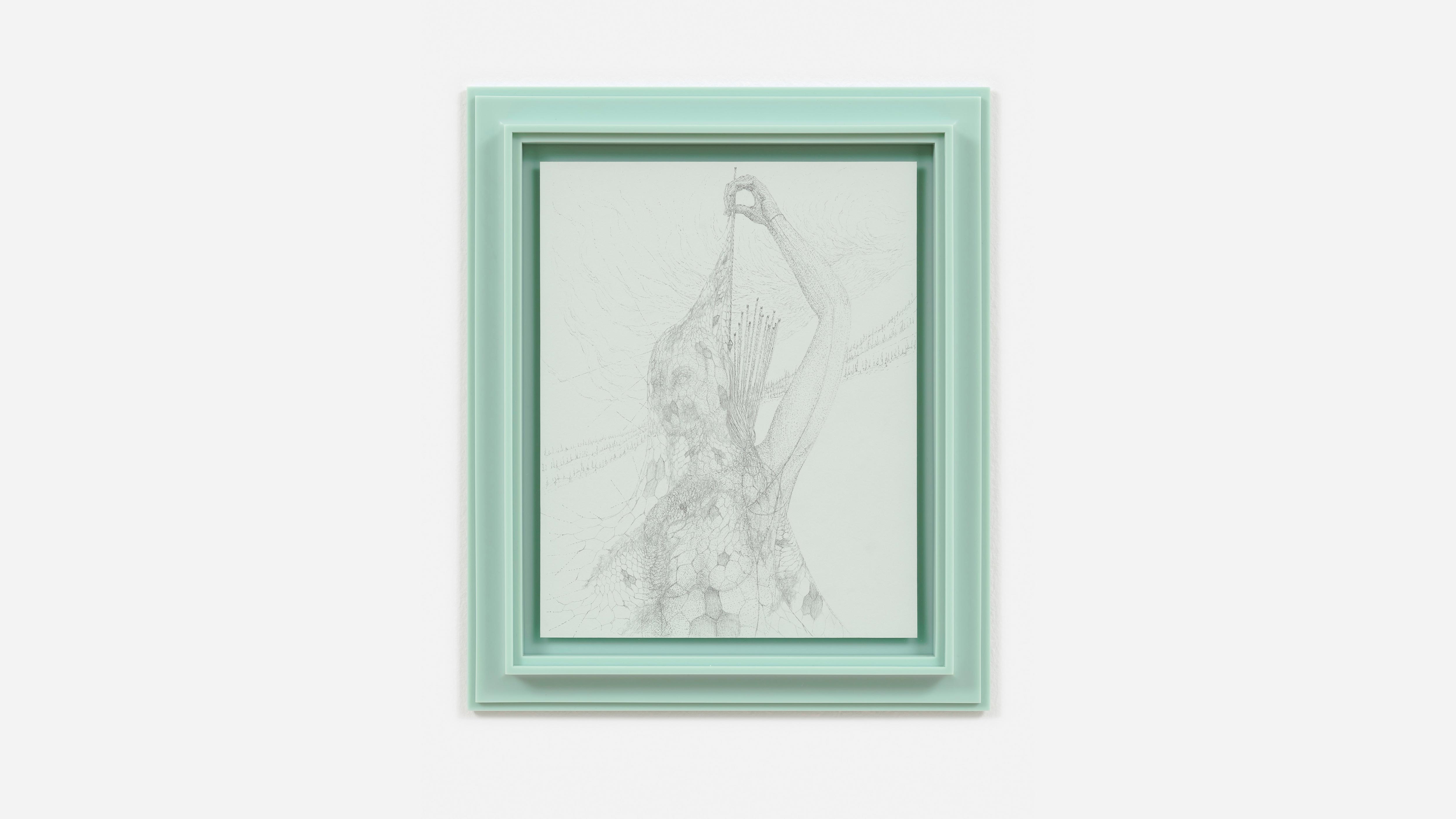 Habitus Graphite, pastel, colour pencil and silver leaf on Arches watercolour, wood frame. Unique work. 20 x 14 ¾ cm, 7 ¾ x 5 ½ inches.